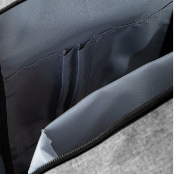 Mochila urbana portanotebook de hasta 16 pulgadas. Compartimento principal con cierre y bolsillo portanotebook y tablet de hasta 11 pulgadas, además bolsillos organizadores de accesorios. Compartimento frontal con 2 bolsillos delanteros. 2 bolsillos laterales, mitad de tela y mitad de malla elástica. Asa color negro. Interior forrado el poliéster gris claro. Correas ajustables y espalda acolchadas. Tira para sujetar la mochila en la manija extensible de un equipaje de mano. Tiradores de cierre metálicos.